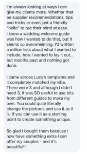 • Wedding planning guide – I send this at enquiry stage: perfect to sway couples into booking you, this guide contains a short ‘about’ section, some pages with reviews, detailed wedding timeline tips, some super helpful wedding planning tips and FAQs